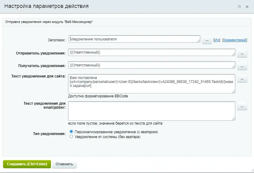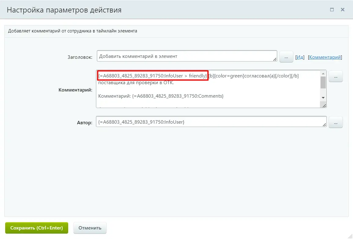 Порой данные полученные с помощью "Вставки значения" в задачах и уведомлениях отображаются неожиданным образом. К примеру, пользователь добавляет ID, а не только имя. Чтобы это исправить пригодится модификатор friendly..